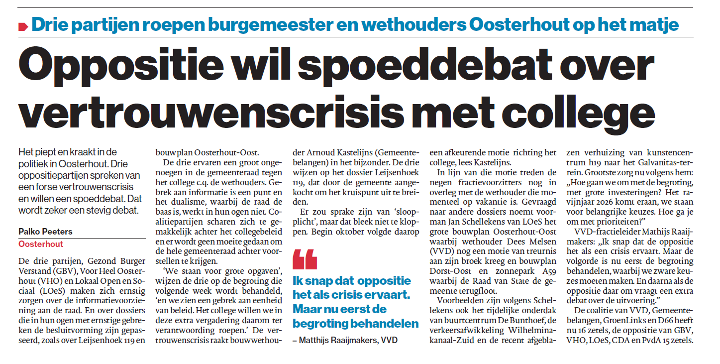 Wij maken ons dan ook ernstig zorgen over het gebrek aan collegiaal bestuur. De afgelopen twee jaar zijn er teveel dossiers gepasseerd waar ernstige gebreken in zaten, waar geen sprake was van actieve informatievoorziening, dualisme met voeten getreden werd en er al een aantal keren moties van treurnis en zelfreflectie klaar stonden. Recent is het vertrouwen nog een keer ernstig geschaad doordat het verzoek om opheldering over het functioneren van een wethouder gelekt is. Wij spreken inmiddels dan ook van een dubbele vertrouwenscrisis. Het is niet verstandig om zonder opheldering met dit college de begrotingsbehandeling in te gaan en besluiten te nemen voor de lange termijn. We staan voor grote opgaven en we zien een gebrek aan eenheid van beleid. Het college willen we in deze extra raadsvergadering daarom ter verantwoording roepen.